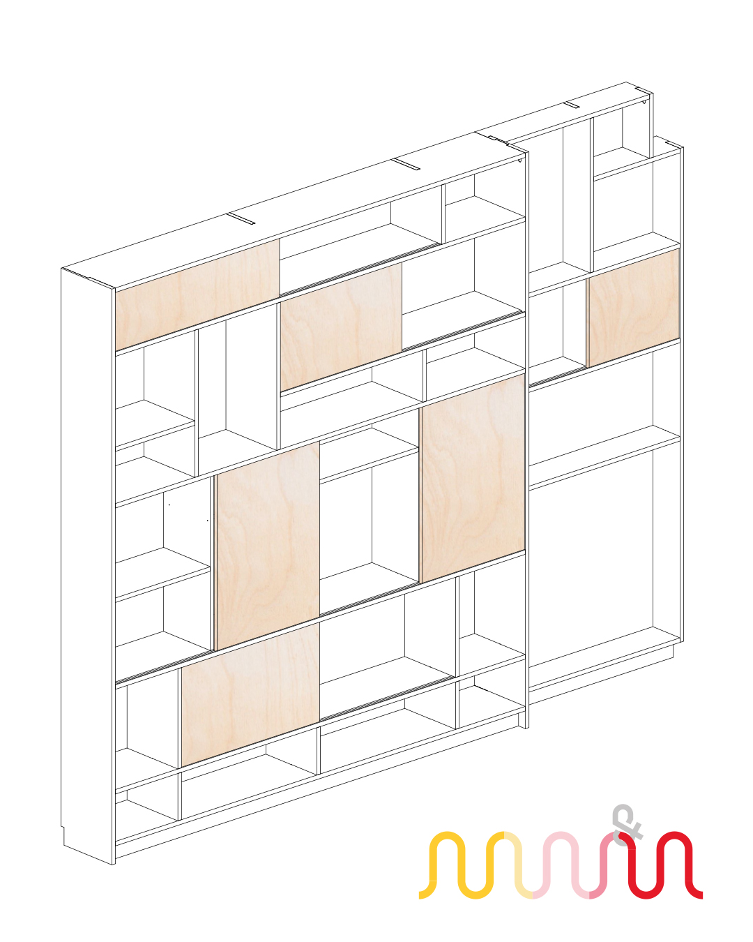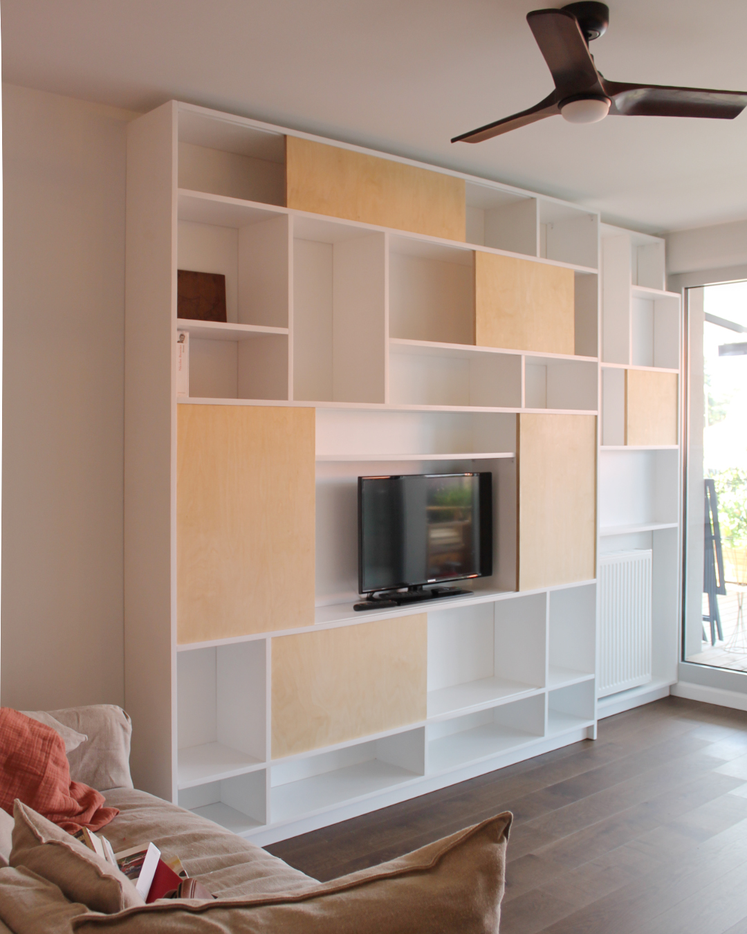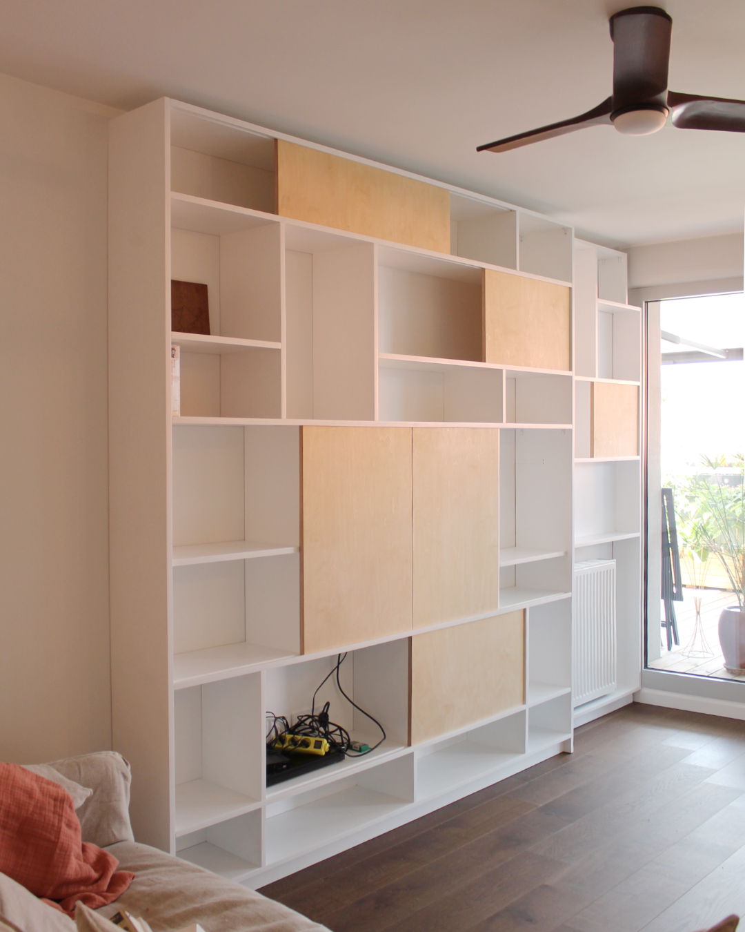 Portes coulissantes : contreplaqué bouleau, finition huile cirée naturelle