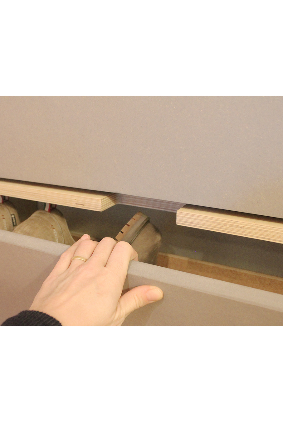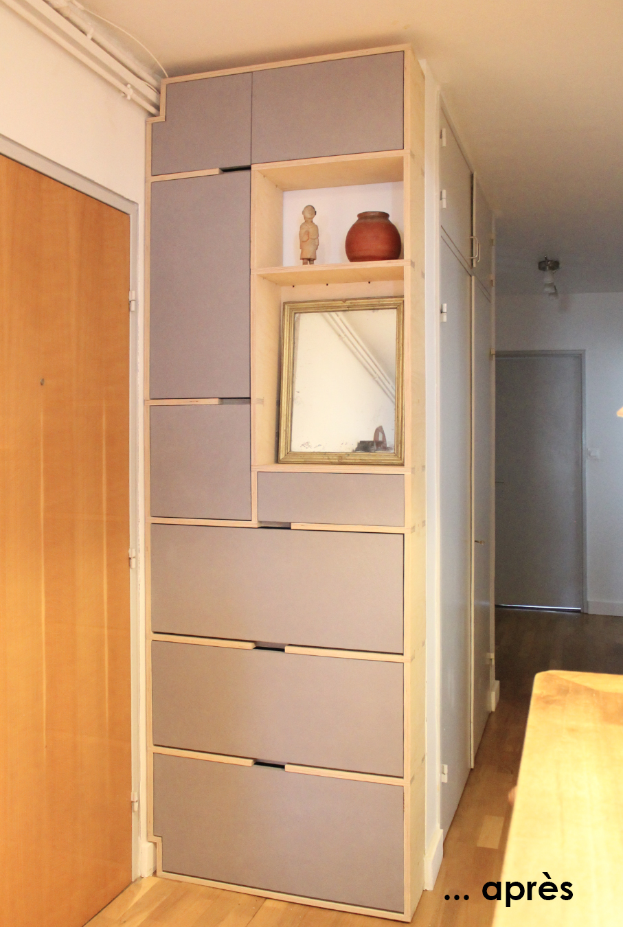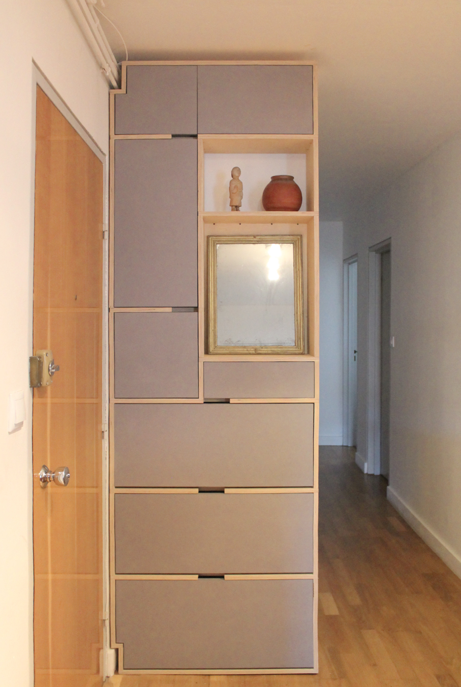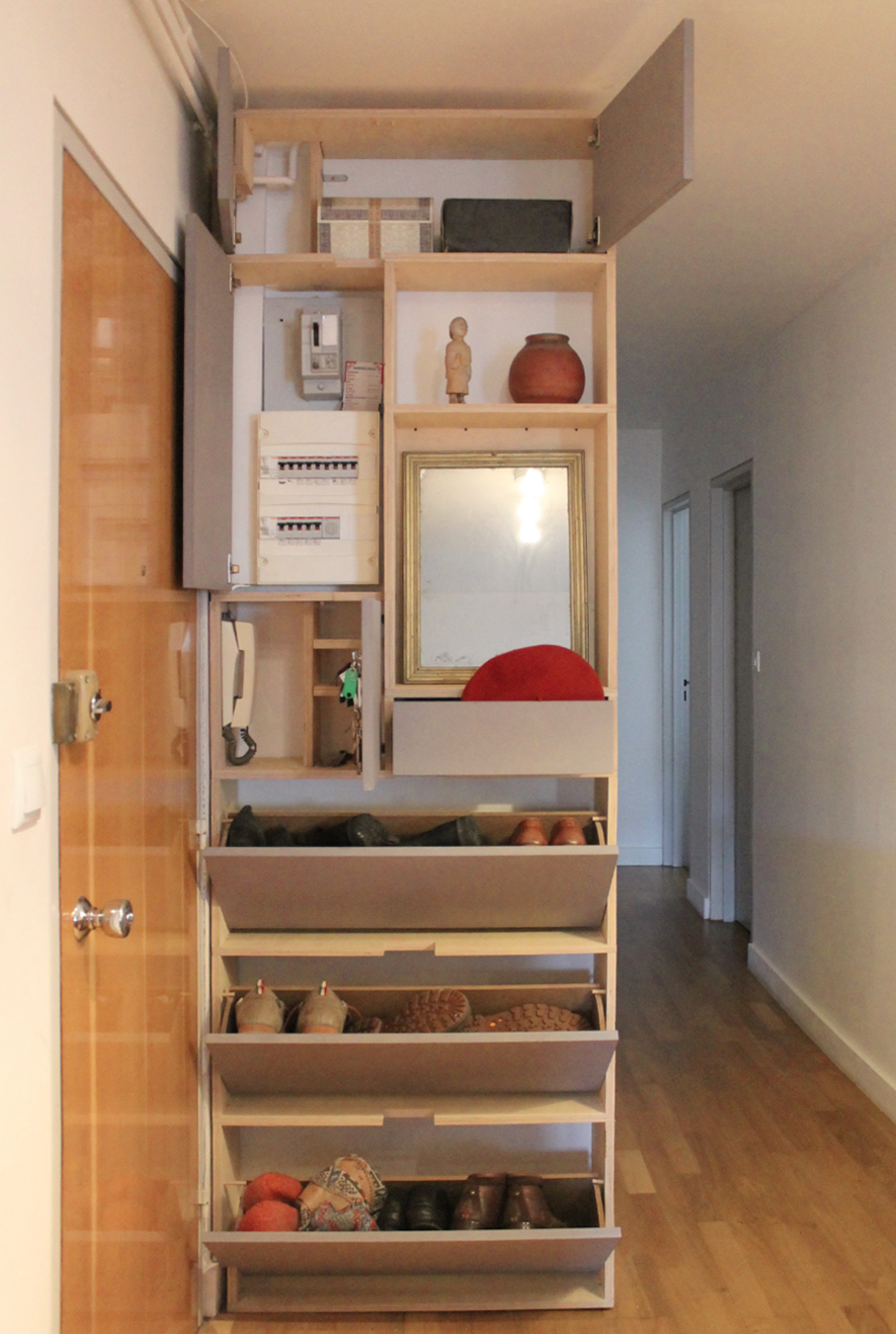 Le client souhaitait un meuble de rangement pour stocker les chaussures et d’autres objets et ainsi cacher le tableau électrique existant et des réseaux apparentes.