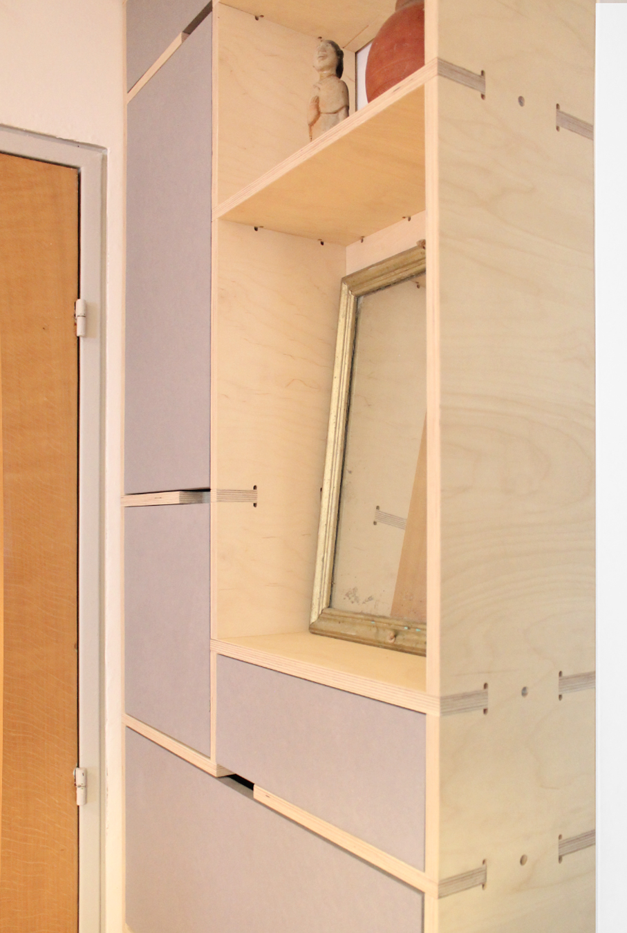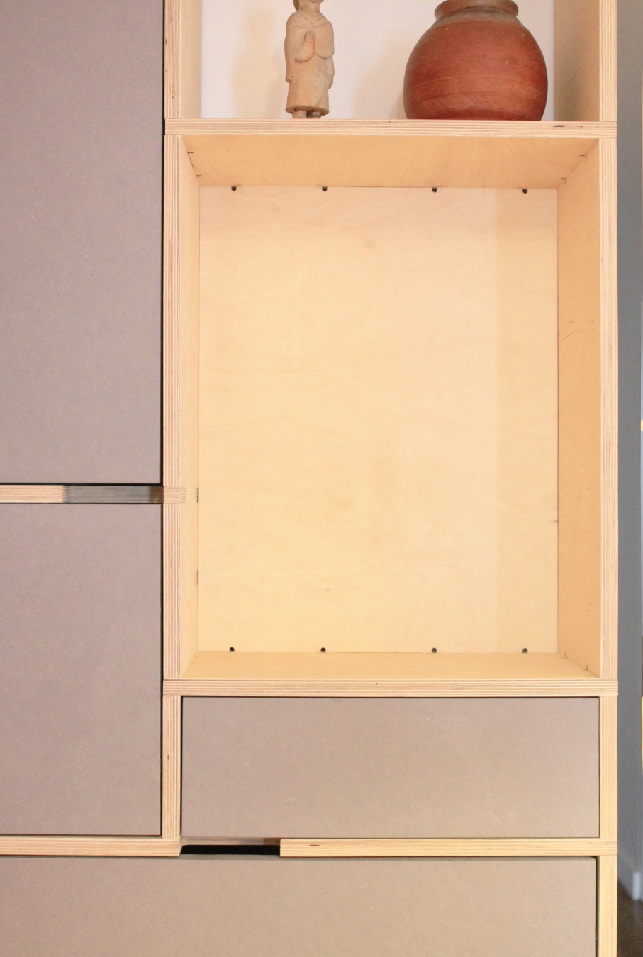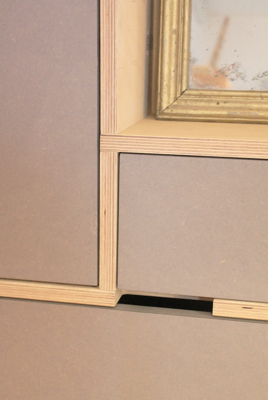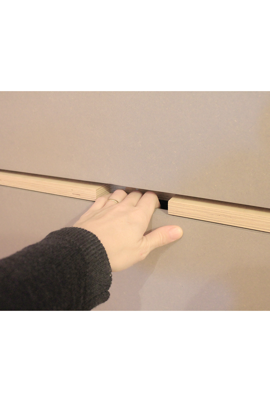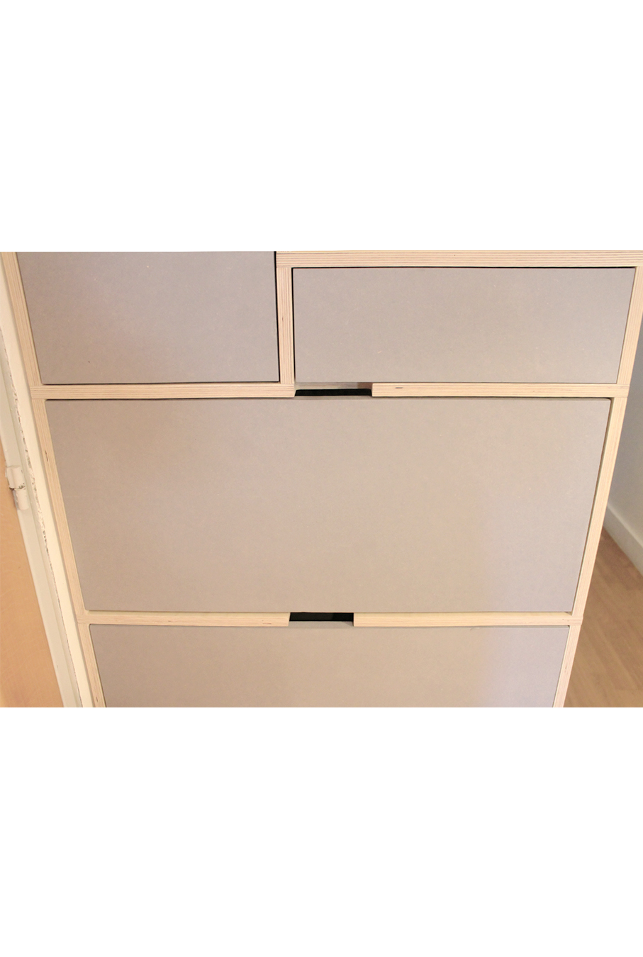 Détails : portes encastrées avec poignée découpée dans le caisson;